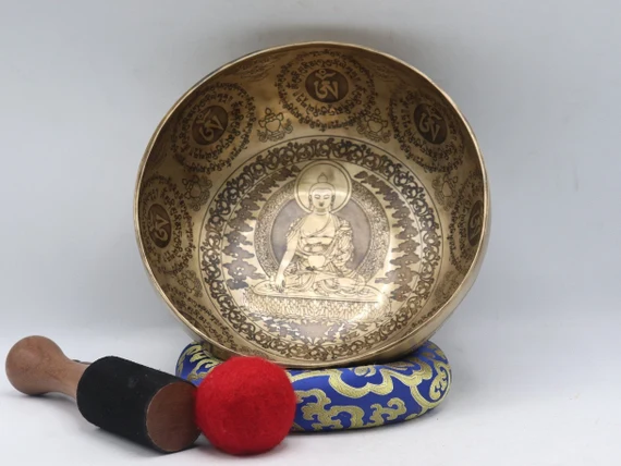 Handmade meditation singing bowl engraved with Buddha.