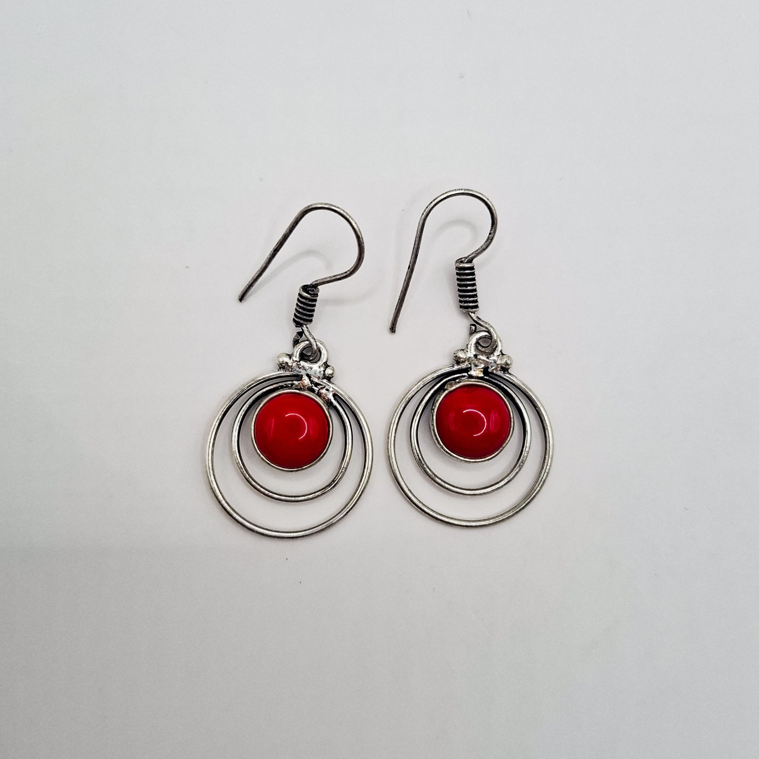 Add a touch of charm to your look with these beautifully crafted white metal earrings. Featuring a striking red bead at the center, these earrings are designed with two delicate circular hoops that create a unique, eye-catching design. Lightweight and comfortable to wear, they are perfect for both casual and festive occasions.